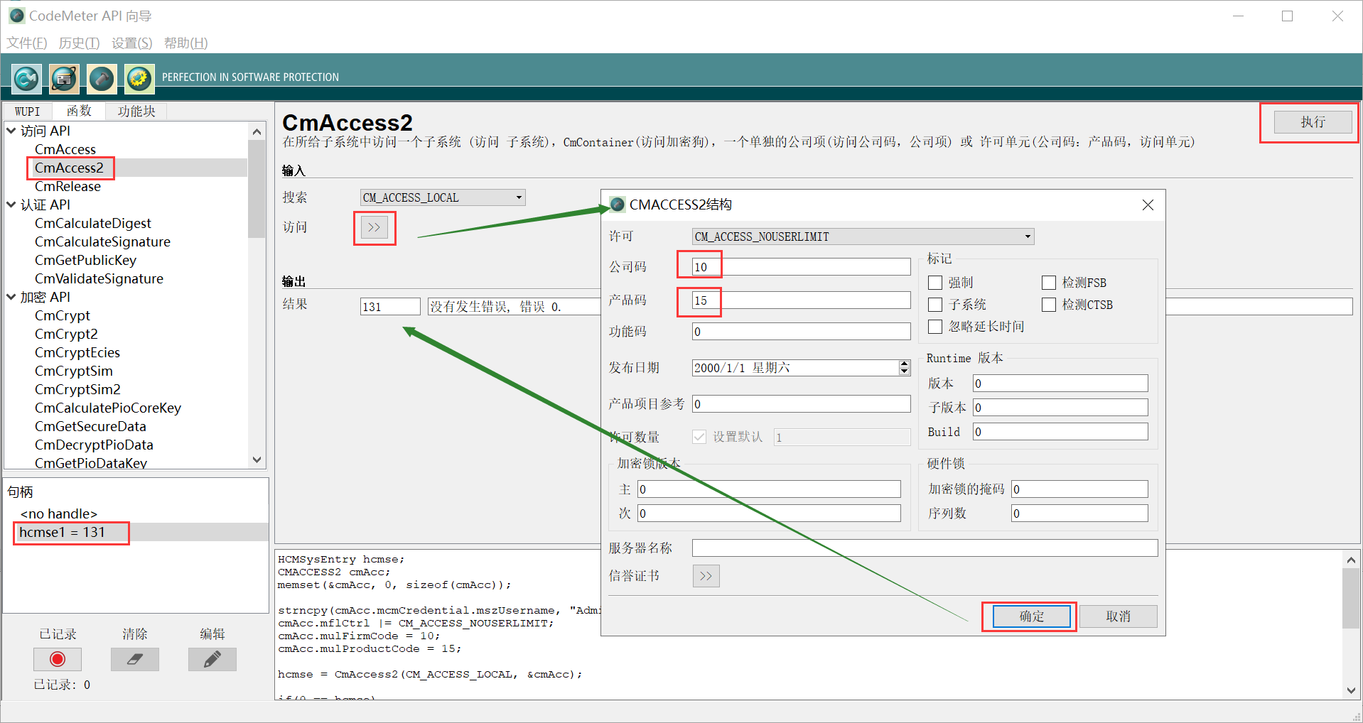 3.首先获得访问加密锁许可的句柄,打开CodeMeter API 向导,点击“函数”页,点击“CmAccess2”功能函数,单击右侧页面中的“访问”旁边的按钮,输入公司码10,产品码15,点击“确定”按钮,如果结果框中显示有效句柄和“没有发生错误”的消息,则证明已经获得加密锁中有效的许可访问。如下图所示: