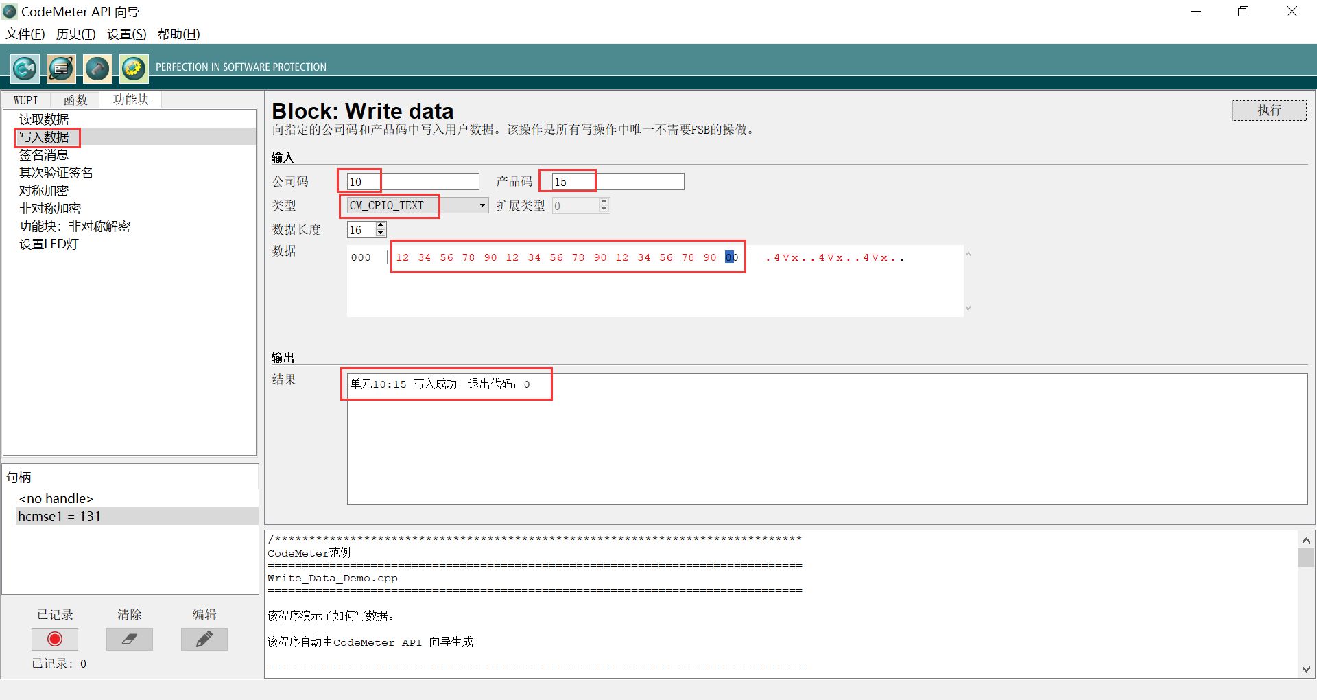 4.写入数据(仅限产品码文本信息及用户数据信息)。输入公司码10,产品码15,选择“类型”旁的要写入的数据类型,“CM_CPIO_USERDATA”为用户数据,此数据无需母锁便可读可写,“CM_CPIO_TEXT”为产品码在CodeMeter控制中心显示的文本信息,在“数据长度”旁的框中输入双字节数据长度,在“数据”旁的框中输入要写入的16进制数据,点击“执行”按钮,如果结果框中显示 “写入成功”的消息,则证明已经成功写入了数据。“输出”栏下方即为自动生成的代码段。如下图所示: