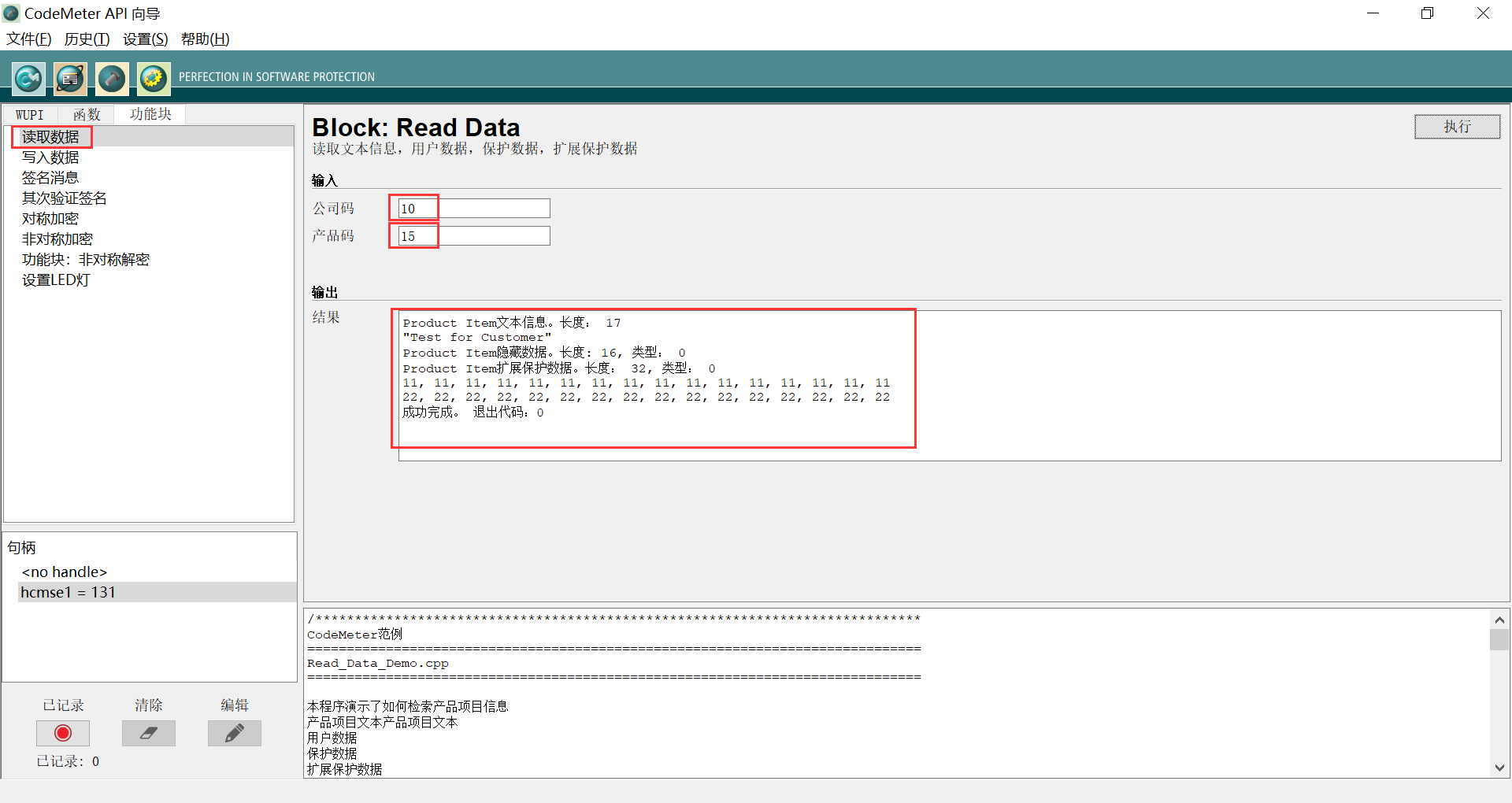 5.读取数据。输入公司码10,产品码15,点击“执行”按钮,如果结果框中显示 “成功完成”的消息,则证明已经成功读取了数据,相应的写入了保护数据、用户数据、隐秘数据、用户数据,那么读取时会将写入的数据依次序显示出来。“输出”栏下方即为自动生成的代码段。如下图所示: