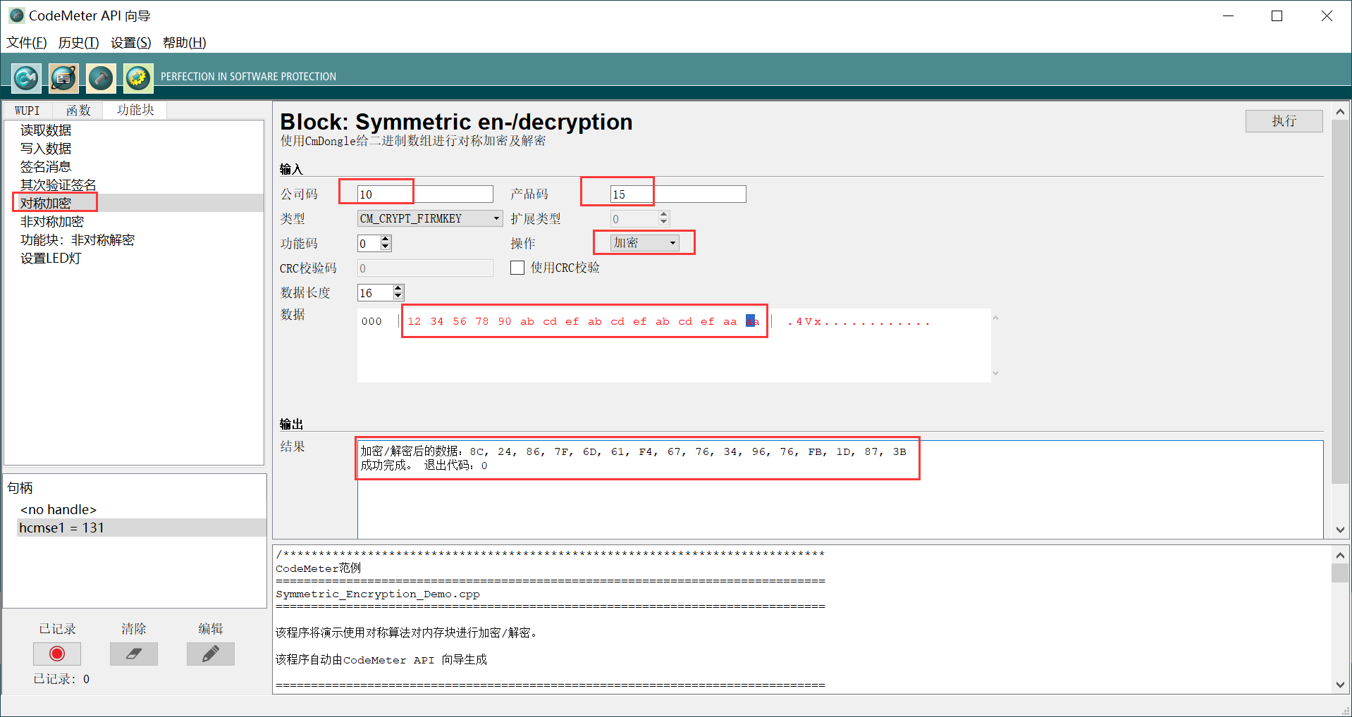 4.对称加密:点击“功能块”页,点击“对称加密”功能函数,输入公司码10,产品码15,选择“类型”旁的要写入的数据类型,“CM_CRYPT_FIRMKEY”,选择“操作”为加密,在“数据”旁的框中输入要写入的16进制数据,点击“执行”按钮,如果结果框中显示 “成功完成”的消息,则证明已经成功使用了对称加密算法对数据进行了加密。“输出”栏下方即为自动生成的代码段。如下图所示: