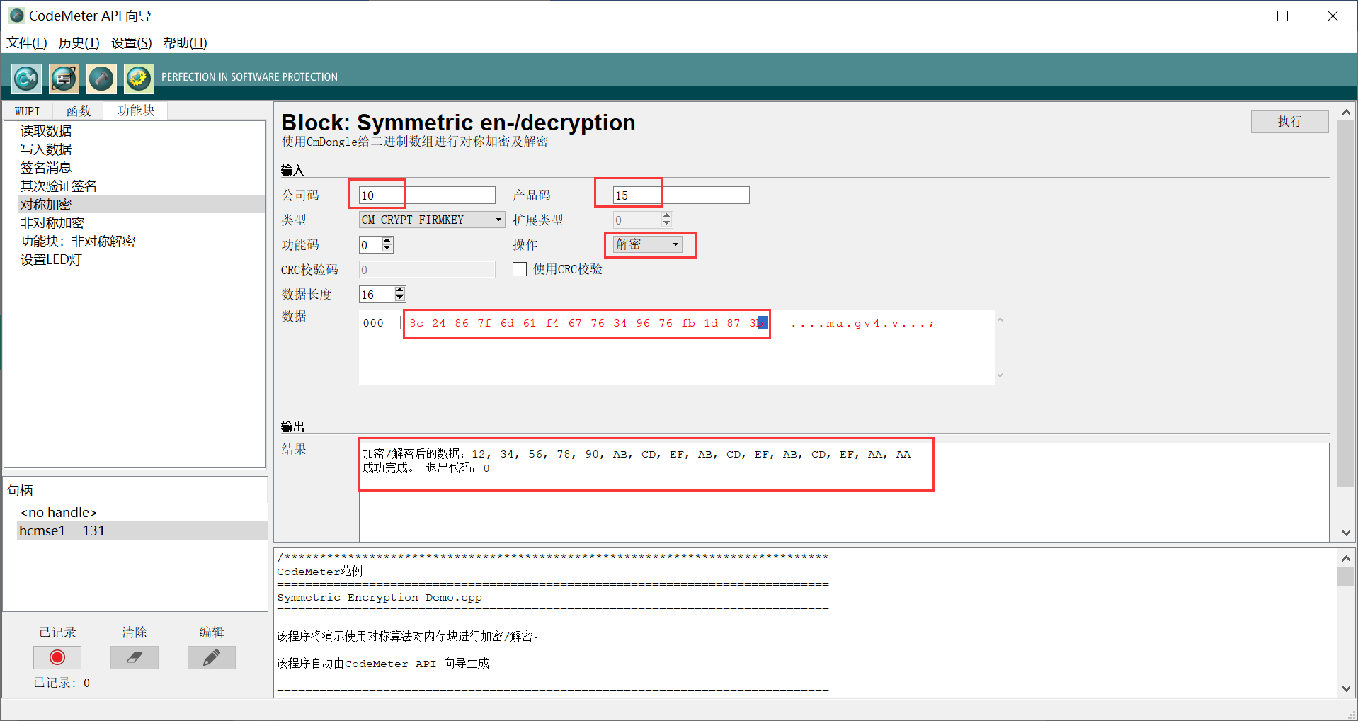 5.对称解密:点击“功能块”页,点击“对称加密”功能函数,输入公司码10,产品码15,选择“类型”旁的要写入的数据类型,“CM_CRYPT_FIRMKEY”,选择“操作”为解密,在“数据”旁的框中输入上一步“输出栏中”加密后的的16进制数据,点击“执行”按钮,如果结果框中显示 “成功完成”的消息,查看结果为上一步中要加密的数据,则证明已经成功使用了对称加密算法对数据进行了解密。输出”栏下方即为自动生成的代码段。如下图所示: