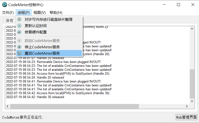 当您在使用时,遇到error407 错误,可以尝试关闭加密程序,打开CodeMeter控制中心,重启CodeMeter服务。