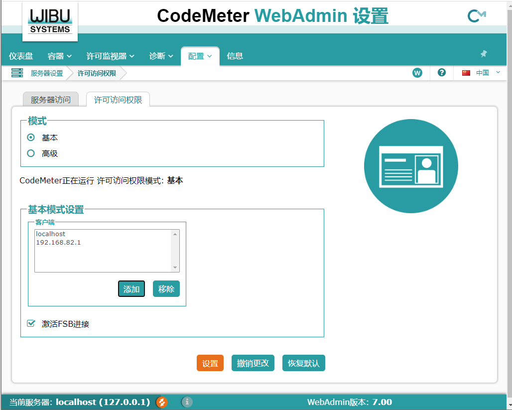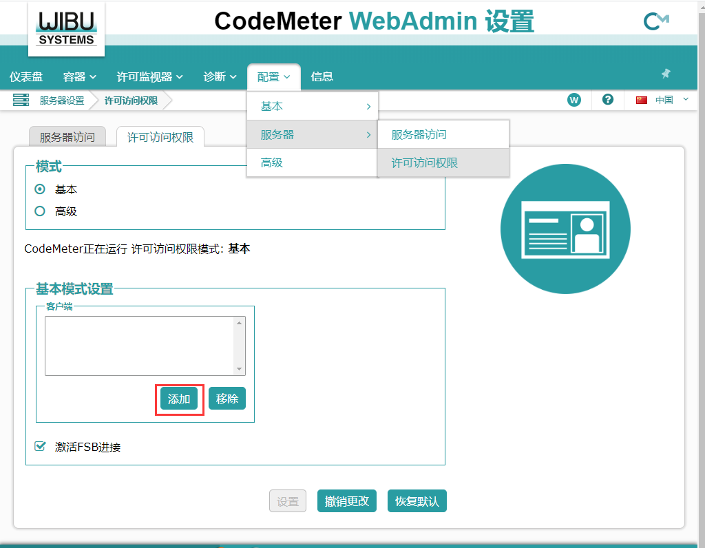 在Web管理界面里如下图所示,选择配置->服务器->许可访问权限,在基本模式设置下,点击添加,添加允许访问服务器授权的IP地址(不在地址列表里的IP都将无法访问)。