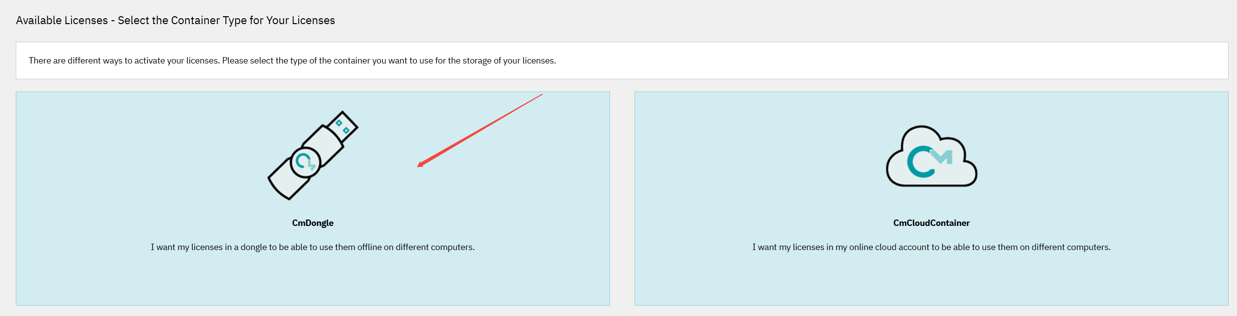 5. 选择要接收授权的加密锁类型,硬锁选择 CmDongle,软锁选择 CmAct License,此处以硬锁为例:
