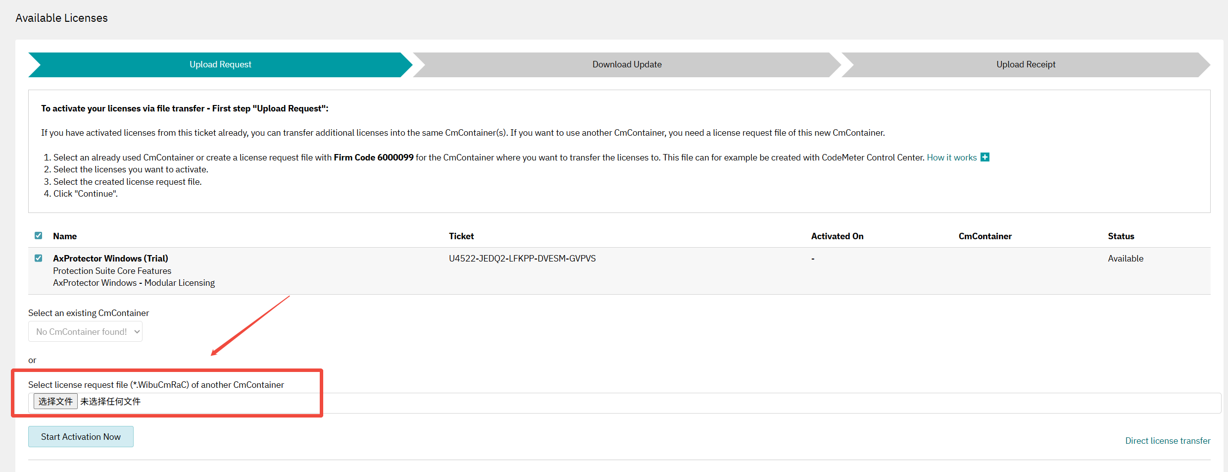 7. 点击 选择文件 按钮,上传第 2 步生成的 WibuCmRaC 文件,上传完成后,点击下方的 Start Activation Now 按钮: