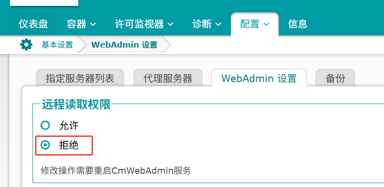 您可以打开对应设备的web管理界面,依次进入【配置】-【基本设置】-【WebAdmin 设置】中,将【远程读取权限】项改为【拒绝】: