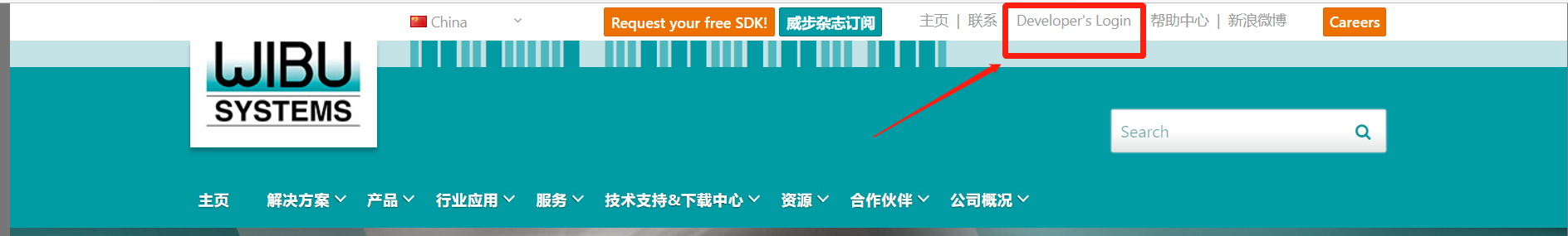 2. 您可在我司官网下载获取最新版本 msi格式 的安装包,进入 www.wibu.com.cn 网站,点击右上角的 Developer's Login 按钮,登录您的开发者账号或我司提供的测试用开发者账号: