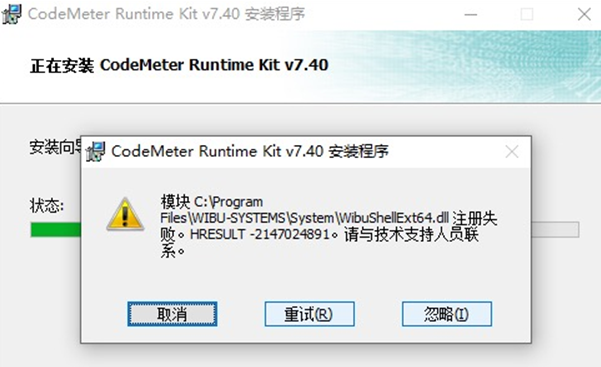 或者直接点击忽略继续安装过程,此dll主要用于桌面双击的功能,忽略不会影响授权的使用安装CodeMeter Runtime时可能遇到的WibushellExt64.dll注册失败问题,通常由权限问题引起。尝试以管理员权限运行安装程序、搜索微软支持网站上的解决方案,或者直接忽略该错误继续安装,都是可行的解决方案。