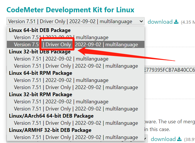 CodeMeter DEV,注意选择带有 driver only 标识的下载项目: