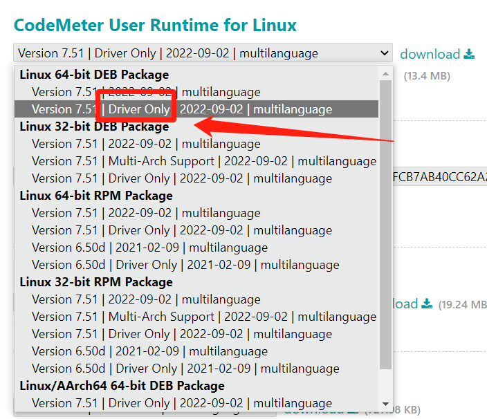CodeMeterRuntime,注意选择带有 driver only 标识的下载项目: